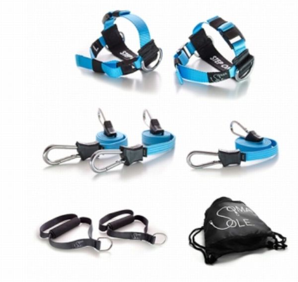本製品は、足のサイズに合わせたフットハーネスと抵抗バンドのスナッププルーフリンク、調節ハンドル、持ち運びバッグからなるトレーニングツール。