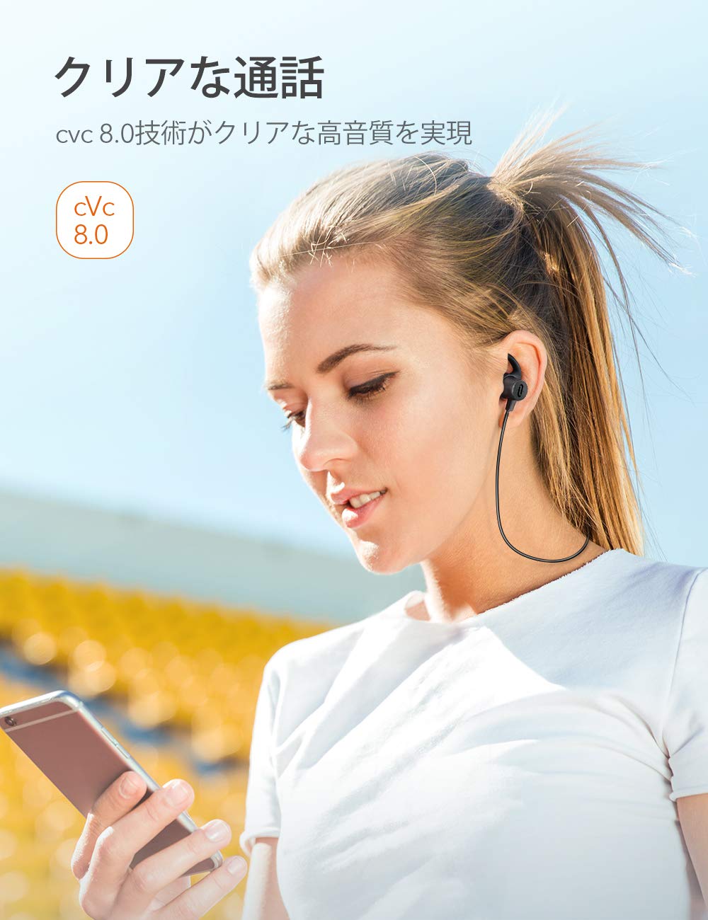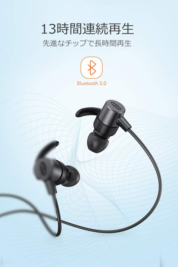コーデックはAAC、aptX、aptX HDに対応。iPhoneやAndroidなど、ほとんどのスマートフォンで高音質再生を実現する。さらに、ケーブル連結タイプのワイヤレスイヤホンとしては、最長クラスの最大13時間の連続再生に対応し、汗や雨などからイヤホンを守る生活防水IPX5の防水性能でワークアウトでの利用にも適した製品となっている。