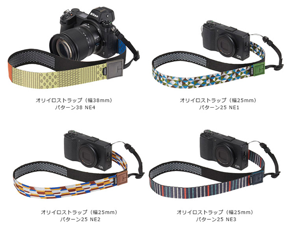 ミラーレスカメラのサイズに合う「ハクバ オリイロストラップ パターン25(幅25mm)」からは3種類のデザインが登場。「NE1」「NE2」「NE3」それぞれが彩り豊かなデザインに仕上がっている。パターン38と同様に、プリントではなく織り柄で、根革は本革製となっている。裏面には同じく滑り止め素材を使用。販売価格は各4,200円(税抜)だ。