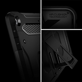 「タフ・アーマー テック」は、優れた耐衝撃性能が特徴のケース。米軍MIL規格を取得するその頑丈さは、TPU素材のインナーカバーをポリカーボネートパネルで補強する二重構造によるもの。落下した場合でも、衝撃からデバイスを保護する。また、落下した際のダメージが大きい四隅には、衝撃を軽減するエアクッションテクノロジーを採用。さらに、ケースの内側には網状パターンを施しており、衝撃吸収の効果を高めている。
