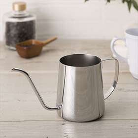 コーヒードリップポットは、容量390ml。注ぎ口は、わずかに反り返る細長口なので、水切れが良い。ドリップで注ぐお湯の量を細かく調整することができる。また、サイズは高さ188mm×幅275mm×奥行107mmとコンパクトだが、開口部が広く洗いやすい設計となっている。