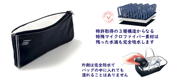 「beau-nuage」は、丈夫で防水に優れた軽量折りたたみ傘。耐衝撃性能を高めるために、フレームにはステンレス・ニッケル・アルミニウム・強化ファイバーガラス、シャフトにはアルミニウムとスチールの特殊合金を使用している。また、傘表面のコーティングと特殊素材による撥水力だけでなく、収納カバーも内側の吸水性・外側の防水性に優れていることが特徴。特殊マイクロファイバー素材が3層構造となっており、特許を取得している。
