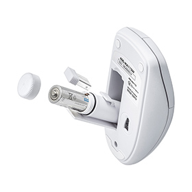 「400-MA113W」のサイズは、約W61.6×D115×H36mmで重量は約65g。単3電池1本で動き、電池ケースは完全防水となっている。レシーバーは防水・防塵機能を搭載していないが、マウス本体の電池カバー内に収納することができる。なお、カラーバリエーションはホワイトのみ。