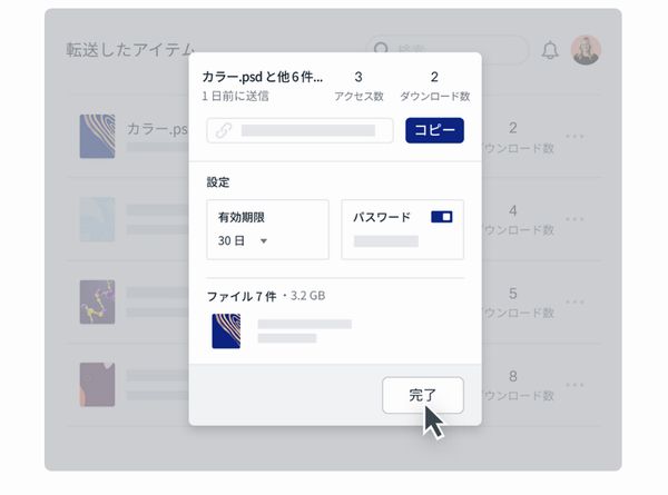 また、ファイルにはパスワードと有効期限の設定も可能。相手がファイルを受け取ったかどうかを確認できるダウンロード通知機能や、ファイルがダウンロードされた回数を示す統計機能も搭載している。