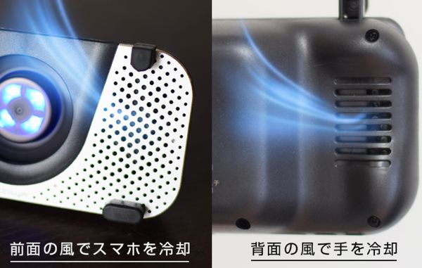 本製品は、スマホでのゲームプレイ時にグリップと冷却を同時に叶えるアイテム。スマホをセットすれば、本体の前面から吹き出す風でスマートフォン本体を冷却。また、背面から出る風は、プレイヤー手の表面を冷やし手汗によるグリップ力の低下も防げる。