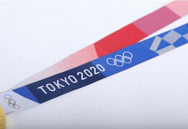 また、選手にメダルをかけるときに使われるメダルリボンは東京2020大会を象徴する藍と紅で日本らしい組市松紋をデザイン。祝祭感とともに多様性と調和を表現し、視覚に障がいのある方が手で触れることで順位がわかるように、うら側にシリコンプリントで金メダルには1つ、銀メダルには2つ、銅メダルには3つの凸の加工が施されている。