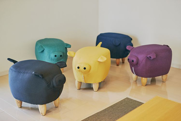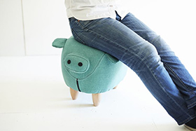「ぶたさんのスツール」は、座面のほどよい弾力でオットマンやイスとして使うことができるスツール。「Steve(スティーブ)」という名前が付けられており、その由来はスツールとブーブーというブタの鳴き声を掛けたものだという。玄関に置いて靴を履く支えにしたり、リビングのうたた寝で使ったり、利用方法は幅広い。また、女性でも持ち運びがしやすいよう軽量設計となっている。