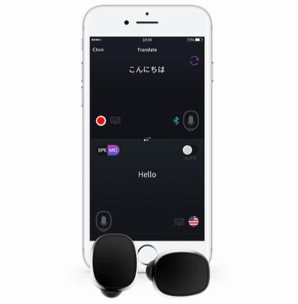 例えば、英語圏の相手と話す場合は、自分の耳に1つ、話し相手の耳に1つを装着。自分の日本語は相手の耳には英語に自動翻訳され、相手が話した英語は日本語に翻訳されて聞こえる。