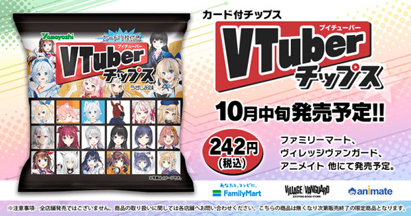 株式会社eStreamは、バーチャルYouTuber(VTuber)のオリジナルカードが付いた「VTuberチップス」を2019年10月中旬をめどに発売することを発表した。ファミリーマート(宮崎県・鹿児島県を除く)、ヴィレッジヴァンガード、アニメイト、オンラインショップのeStream Storeで順次発売。全16組の人気VTuberのオリジナルカードを集めることができる。価格は242円(2019年8月20日時点での税込価格)。