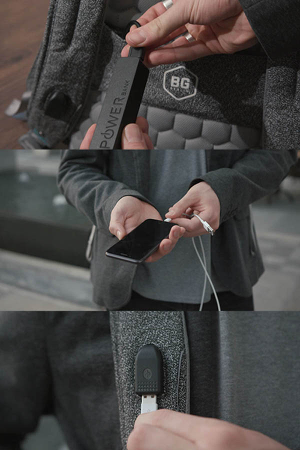 「メトロバッグCR」のサイズはH46×W36×D15cmで重量900g。容量は16Lとなっている。収納部分は全部で13カ所あり、ケーブルやタブレット、ペンホルダーなど使い分けられる。背面ポケットにはUSBコードがあり、モバイルバッテリーをつないでおくと、取り出すことなく充電が可能だ。