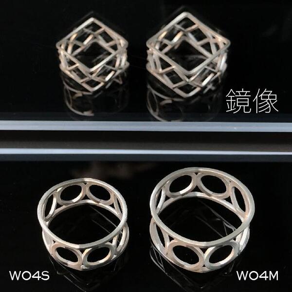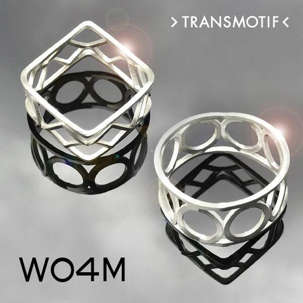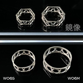 本製品は、「変身立体」理論を用いたシルバーアクセサリーで、見る方向によって丸や四角に見える。約1年の開発期間を経て登場する新製品。「W04系」は上下(前後)の丸が四角に、周りにある8つの丸も四角に変身するリングだ。丸く見えていた形状が、方向を変えると四角く見える。