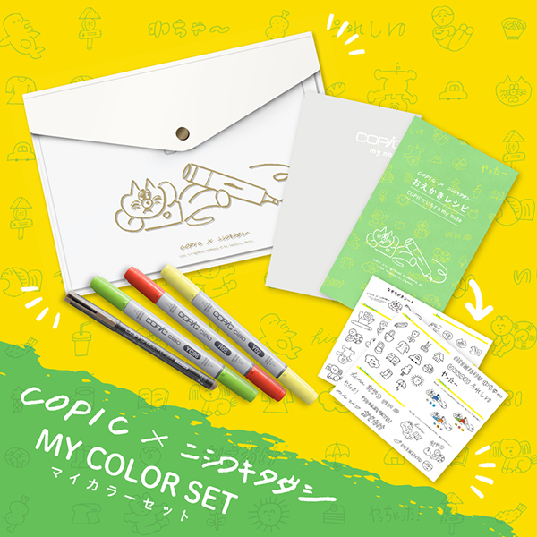 さらに「文具女子博2019」の会場では、「COPIC my note」の限定発売と合わせて、人気のイラストレーター・ニシワキタダシとコラボした限定セット「COPIC×ニシワキタダシ MY COLOR SET」も発売。描き下ろしイラストデザインのポーチ、ステッカー、なぞりがき見本帳もセットにしたお得なものとなっている。