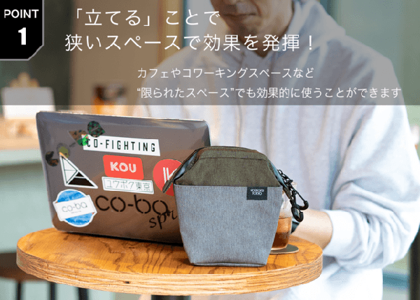 「立てる」ことでカフェやコワーキングスペースなど限られたスペースでも効率的に使うことでき、口金にワイヤーフレームを入れることで、一瞬でパッと開いて瞬時に中身が把握できるように。そして一回り小さくし、従来の「デイズポーチ」では置きづらかった小さなテーブルなどでも使いやすく作られている。