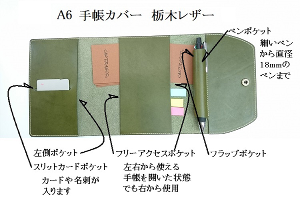 カードや名刺を入れておくのにちょうどいい「スリットカードポケット」と、左右両方からアクセスできる便利な「フリーアクセスポケット」。さらにフラップの内側にもポケットを設けるなど小物収納場所も豊富で、フセンやシールなどを解りやすく収納可能だ。