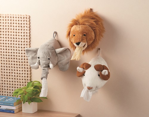 本製品は、どうぶつをモチーフにした壁掛けタイプのロールティッシュケース。ラインナップは、ゾウ・クマ・ヤギ・ライオンの全4種類だ。本製品のうしろからロールティッシュを差し込み、前面からティッシュの先端を出すことで使用できる。後方に付属した輪を使うことで、壁に掛けることが可能だ。ゾウのみ鼻からティッシュを出す仕様になっており、水を噴射しているような見た目が特徴である。