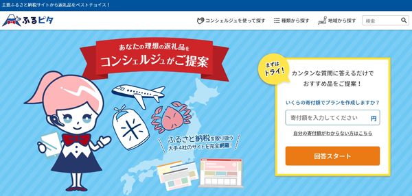 コンシェルジュ機能には、この度新たにイメージキャラクター「ふるピタ子ちゃん」が登場。この機能では、寄付額と5つの質問からライフスタイルを分析し、最適な返礼品プランを提案してくれる。年収・家族構成別の最適な寄付額も解りやすく表示されており、ふるさと納税は初めてという人にはありがたいサポート機能だ。