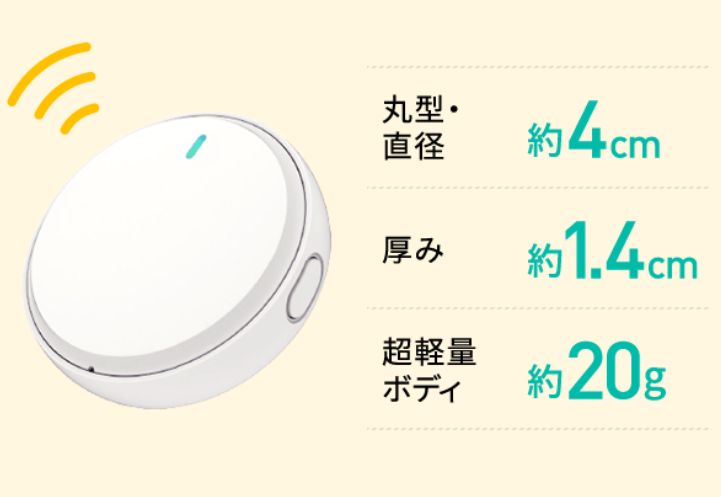 端末は約直径4×厚み1.4cm、重量約20gの小型軽量ボディとなっている。端末を保護するソフトカバーやリュックポーチも別売りで用意している。