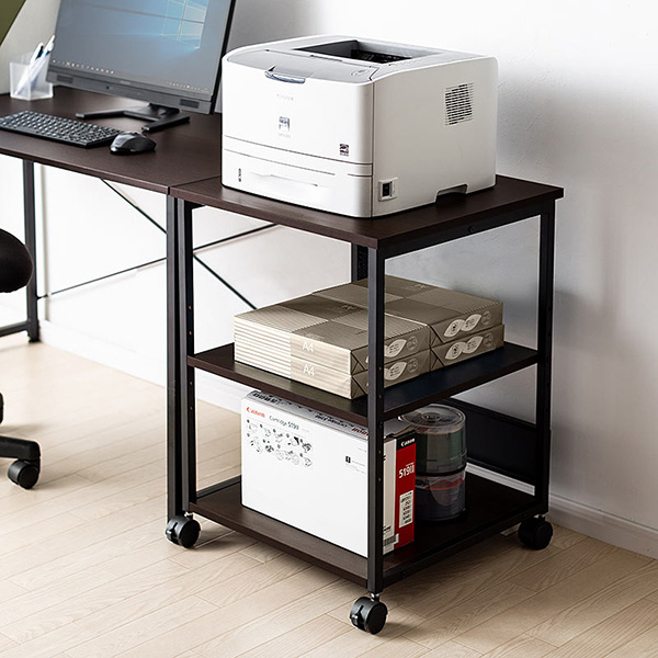 シックな木目調でオフィスだけでなく家庭にも馴染みやすいプリンタ台をサンワダイレクトが販売