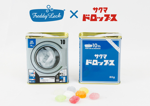 この度は、フレディ レック・ウォッシュサロン トーキョーと同じく、目黒区中央区に本社があるサクマ製菓株式会社とコラボして、ユニークなドロップ缶を製作。懐かしのサクマドロップスがまるでコインランドリーの乾燥器のようなデザインで登場した。