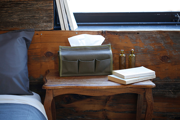 「収納つきティッシュケース」のサイズは横約280mm×奥行約130mm×高さ約190mm。素材には綿帆布(綿100%)を使用している。カラーは3色展開で、「カーキ」「ヘリンボンプリント」「ブラック」を取り扱う。