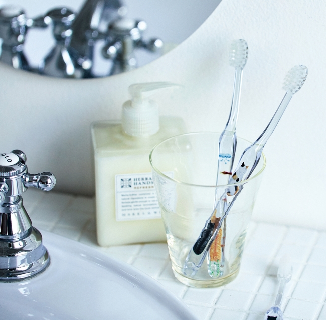 歯医者さんと共同開発したこの歯ブラシは、磨きやすいコンパクトヘッドや小回りのきく眺めの細い柄など、かわいいだけじゃなく機能性も重視している。