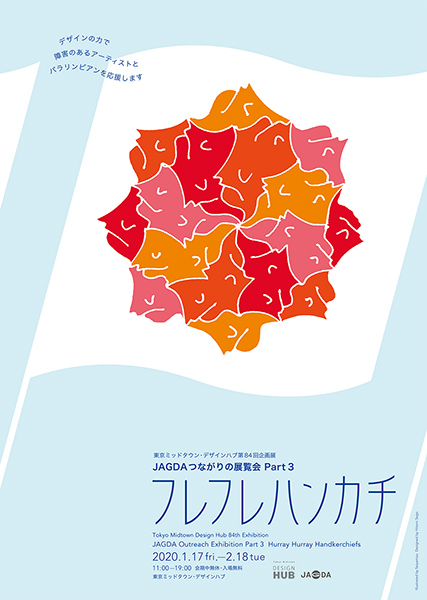 2020年1月17日(金)から2月18日(火)まで、東京ミッドタウン・デザインハブにて、第84回企画展「JAGDAつながりの展覧会 Part3 フレフレハンカチ」が開催される。障害のあるアーティストの作品ライブラリー「エイブルアート・カンパニー」登録作品(一部除く)をもとに、公益社団法人日本グラフィックデザイナー協会(JAGDA)の会員172名がデザインした「フレフレハンカチ」を展示販売。デザイナーはボランティアで参加しており、アーティストへの作品使用料や製造原価を除く販売収益は一般社団法人日本パラリンピアンズ協会に寄付される。