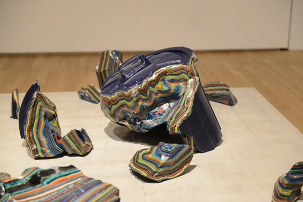小津航氏は、東洋的な絵画空間を再考しながら絵画とモチーフの関係を模索して、アトリエの床に置かれたリンゴを油彩で表現。表良樹氏は、日用品の容器の中にさまざまな色彩の樹脂を流し込み、何層にも積層させた樹脂の塊を落下させて破壊することで、色鮮やかな断面を露わにし、その破片を空間に配置した作品を制作している。増田将大氏は、撮影した風景の画層を同じ場所に投影し、それをまた撮影するという行為を繰り返すことで生まれたイメージを、シルクスクリーンでキャンバスに刷り重ねて作品を制作しているアーティストだ。