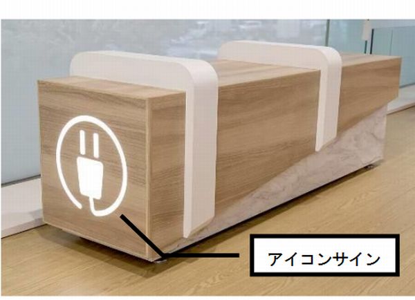 ベンチには充電を想起させるコンセントデザインのアイコンを配し、情報を獲ていない人や訪日外国人でもすぐに充電スポットであることがわかるようにしている。