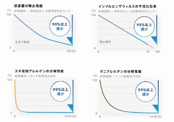 各種性能試験結果では、ウイルスやにおいの元となる菌、アレルギー物質を除菌・分解し、99%以上減少させることに成功している。