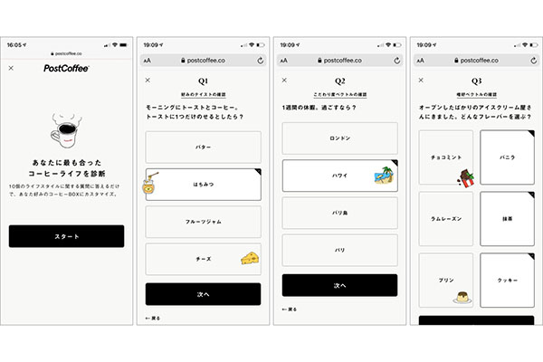 「PostCoffee」はコーヒーボックスがポストに定期的に届くサービス。正式版では、コーヒー診断機能を搭載している。10個の質問に答えることで、約15万通りの組み合わせから適したコーヒーを3種類提案する機能だ。提案内容は淹れ方や頻度だけでなく、量やオプションなどをライフスタイルにあわせてカスタマイズするという。各3杯分となるコーヒー3種、計約140gが毎月届く。