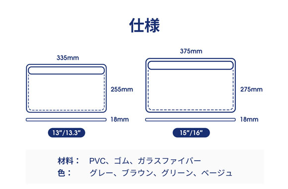 愛用のノートPCに合わせて、13/13.3インチ用と、15/16インチ用の2サイズから選択可能。無駄のないピッタリサイズのケースが手に入るのも魅力的だ。カラーは温かみのあるグレー、ブラウン、グリーン、ベージュの4色を取り揃える。