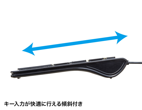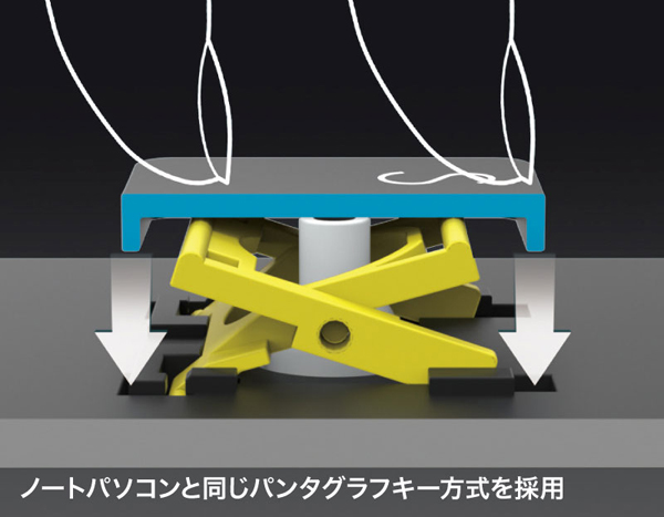 ノートパソコンに多いパンタグラフ方式が採用されており、軽い打鍵感が特徴だ。デスク面との高低差が少ないため、手首や肩への負担が軽く、長時間使っても疲れにくい。また、キートップのどの位置からでも垂直にストロークするため、キーの中心を打たなくても確実に入力することができる。