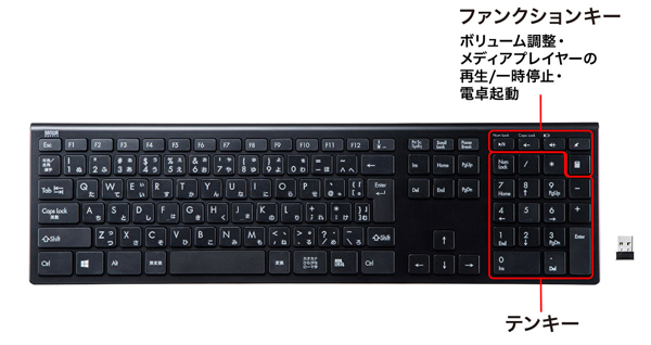 同製品は、誰にでも使いやすい19mmキーピッチ、日本語109配列を採用したスタンダードキーボード。厚さが約20mmと薄型で、音量調整ボタンやパソコン標準の電卓ソフトがワンタッチで起動できる便利なショートカットキーが付いている。