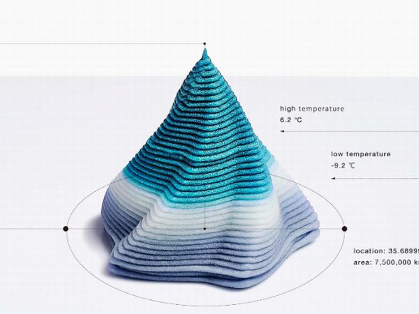 四季の移ろいなどを繊細に表現する和菓子の世界、それをデジタルで表現する。成形は風速・気圧・気温などその日の気象データを元にして、毎日形や色が変わる和菓子として提供される。