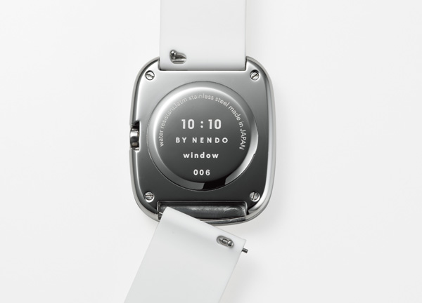 「10:10 BY NENDO」第一弾モデルとして発表された、飛行機の窓をモチーフにした腕時計。楕円形のベゼルからなだらかな曲線を描きつつガラス面へと到達する形状は、シンプルなスクエアウォッチでありながら、従来の時計とは異なる個性的な美を演出する。