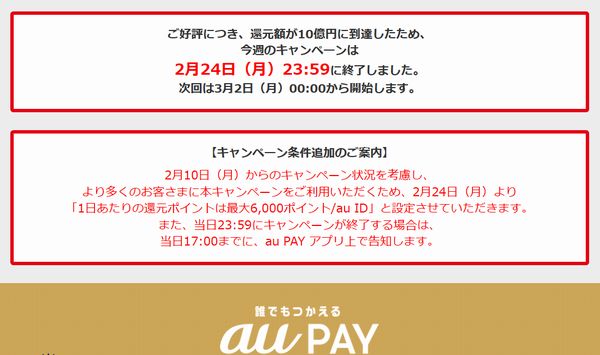 au PAYが「誰でも!毎週10億円!もらえるキャンペーン」として開催している還元キャンペーンについて、第3週となる2月24日スタートの回も1日で終了してしまった(2月24日23:59に終了)。これにより、本日25日は最大20%還元は受けられないことになる。