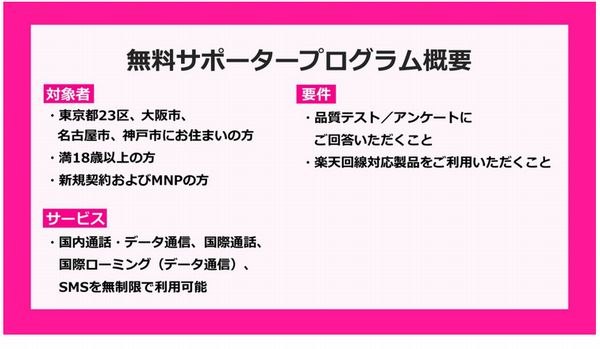 楽天モバイル株式会社は、自社通信網によって運営されるMNO(モバイル・ネットワーク・オペレーター)としてのサービスをスタートするにあたり、モニター的にサービスを提供していた「無料サポータープログラム」のユーザーに対し、期間を延長すると発表した。