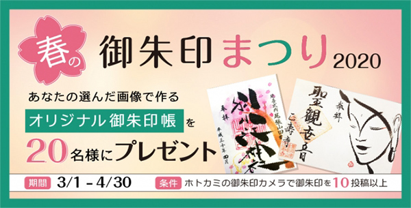 株式会社DO THE SAMURAIが運営する「ホトカミ」は、2020年4月30日(木)まで「春の御朱印まつり」を開催する。「ホトカミ」は、直近1カ月で月間420万ページビュー・120万ユーザーを突破した神社や寺の検索Webサイト。「春の御朱印まつり」は、自宅でデジタル御朱印帳を作るキャンペーン企画となっている。