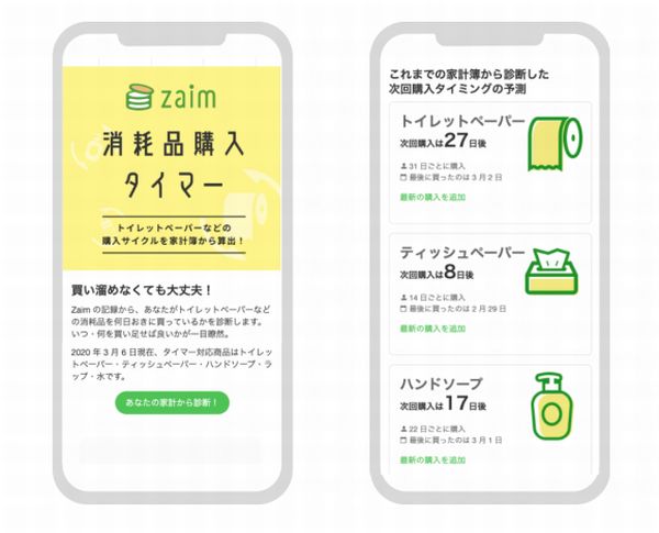 オンライン家計簿サービス「Zaim」を運営する株式会社 Zaimは、トイレットペーパーやティッシュなどの日用品の購入サイクルを家計簿から自動算出できる「Zaim 消耗品購入タイマー」を公開した。