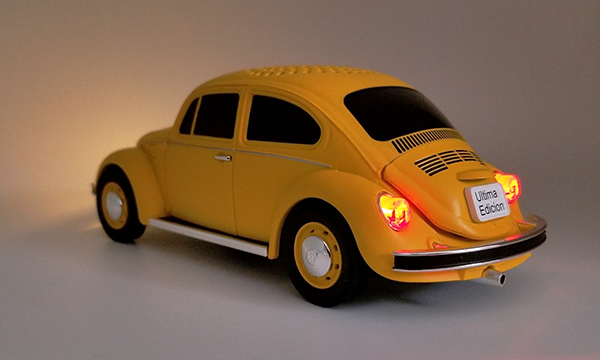 本製品はVolkswagen OLD BEETLEを再現したスピーカー。後方部分は開閉することができ、USBポートとイヤホンジャックを備えている。本体裏には電源とライトのスイッチを搭載しており、ヘッドライトとリアライトは消灯と点灯が切替可能だ。昔ながらのハロゲンランプを忠実に再現。ライトはビートに合わせて強弱に明るさを変える。