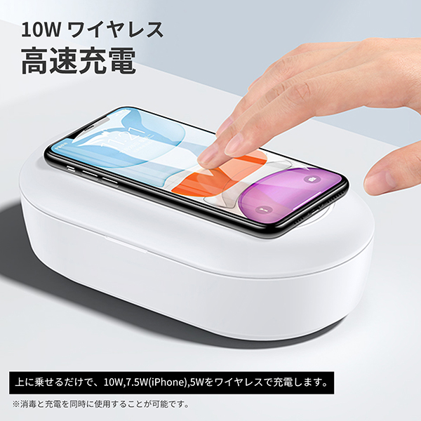 さらに、ケース上にワイヤレス充電機能を搭載しており、除菌したスマホの充電もできるようになっている。10W, 7.5W, 5W対応で高速充電にも対応。充電と同時に除菌モードを利用することも可能だ。