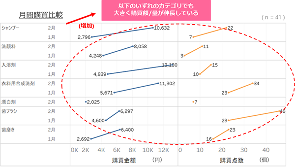 売り切れへの危機感に加えて、漂白殺菌効果や身辺を清潔に保つという意識がこれらのジャンルの消費を押し上げている可能性が高いだろう。