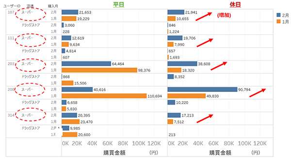 平日休日の購買差において特に顕著な傾向が見られた消費者を深堀りしたところ、大きな特徴としてスーパーの平日購買量が減少、且つ週末に大きく伸びる「まとめ買い実態」がデータからも確認された。