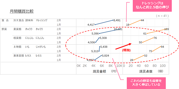 食品系消費材の品目別変化分析においては、意外な消費増の筆頭として「ドレッシング」があり、一か月でなんと2.5倍の伸びが確認された。同時に野菜全般、特に「きゅうり、にんじん、じゃがいも、レタス」も大幅な需要増となっている。