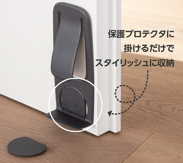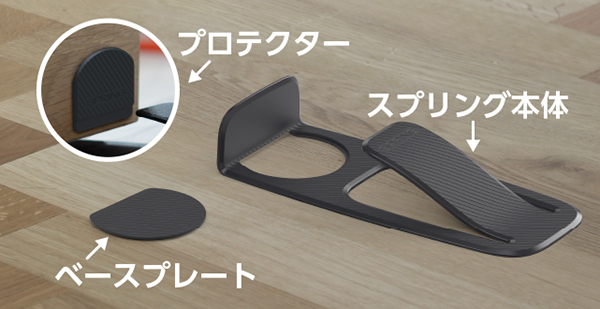 設置は、小さなベースプレートを床に張り付ける形になるが、取り外す際に床を汚さない3M粘着テープが採用されているので賃貸物件などでも安心である。ドアを保護するプロテクターが収納フックの役割を兼ねており、掃除や使用しないときにはスプリング本体を扉に掛けてすっきりと収納しておくことができる。