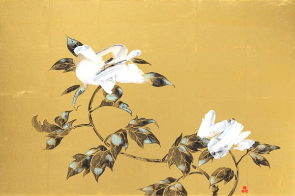 大胆な筆跡で描かれた花は、水墨画や書に見られる筆致を引用しつつ、現代絵画に多く見られるブラシストロークを取り入れることで日本の絵画の“アップデート”を試みたもの。画面に描かれた植物の花の部分のみを単純化した作品は、中国から伝わった漢字を単純化することで作り出された“平仮名”から着想を得た方法で制作されており、日本独特の“型”に置き換える行為を基にしている。