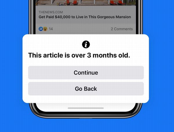 Facebookは、記事の適時性を保つための施策として、古い記事をシェアしようとする際に「通知」をポップアップさせると発表した。
