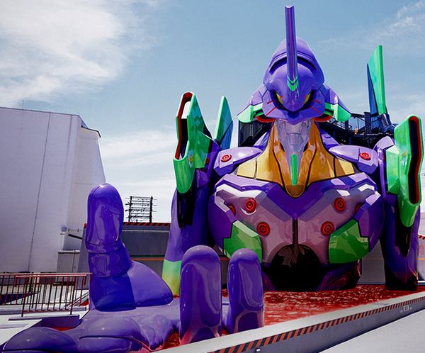 エヴァンゲリオン京都基地では、真っ赤なLCL(作中ではエヴァのコックピット=エントリープラグ内に注水される液体)の中に浸かり、腰から上の約15mを出したエヴァ初号機が登場。