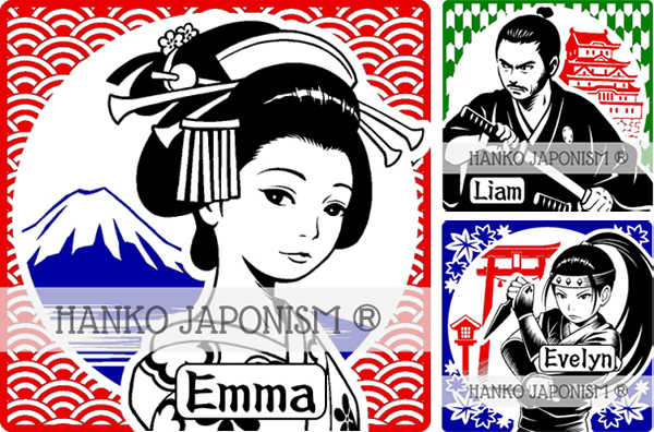 デザインは全10種/20パターンで、忍者、サムライ、着物女性、背景には富士山、城、五重塔、鳥居といった日本らしいモチーフが描かれ、それらが和柄をあしらった額縁から飛び出すようにポーズを決めるデザインは一目で日本とわかるものだ。