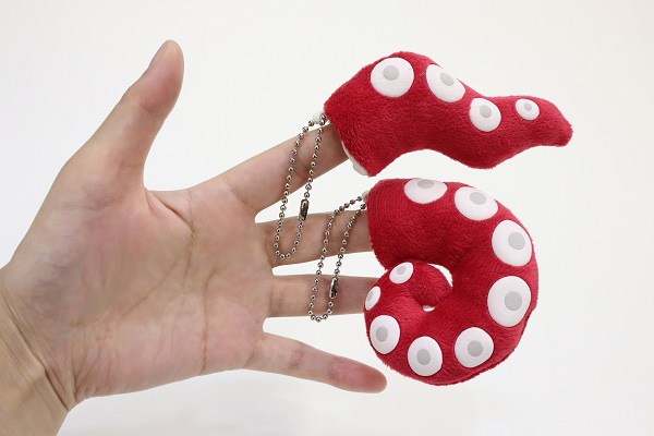 「蛸の手」のクッションだけでなく、キーチェーンも登場。クッション同様に巻きと伸びの2タイプがあり、どちらも穴があるので指が入る。巻きキーチェーンが約10cmで、伸びキーチェーンが約9cm。価格はどちらも1,320円(税込)となっている。
